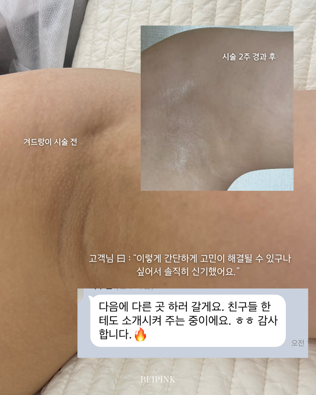 팔꿈치, 무릎, 겨드랑이 착색. 평소엔 잘 안 보이지만 여름만 되면 신경 쓰이죠. 그런데 매년 같은 고민을 반복하고 계셨다면 올해만큼은 달라지길 바라요. 지금부터 시작하면 2~3주 안에 눈에 띄게 밝아진 바디톤을 경험할 수 있습니다. 단 한두 번의 짧은 방문으로 민소매, 반바지, 수영복을 당당하게 입을 수 있게 되는 거죠. 착색 고민은 부끄러운 게 아닙니다. 지금 관리하면 누구보다 당당한 여름을 맞이할 수 있어요.